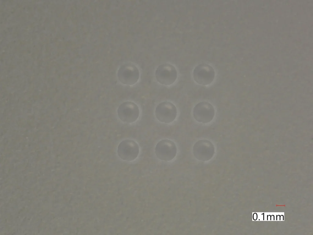 厚さt1mmのアルミナへの貫通穴加工。熱影響がなく直径φ300µmの穴を加工できています。