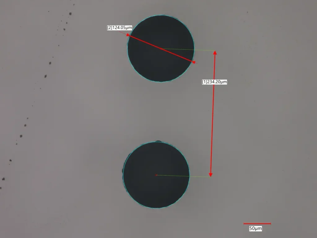 ガラスへも割れなく加工ができます。真円度の高い穴加工を実現しています。超短パルスレーザの長所を活かした加工です。