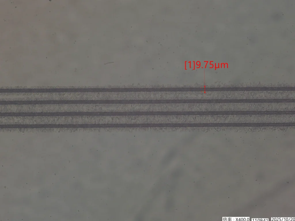超短パルスレーザ加工 USP Laser Processing ポリカーボネイト 溝加工 詳細 DETAIL 属性 ガラス・セラミック加工 材料名 ポリカーボネイト 加工種類 溝加工 加工方法溝加工 ポリカーボネイトへ幅10µmの微細溝形成。熱に弱い材料へも、超短パルスレーザで微細加工が可能です。 関連キーワード KEYWORD ポリカーボネイト 微細 溝