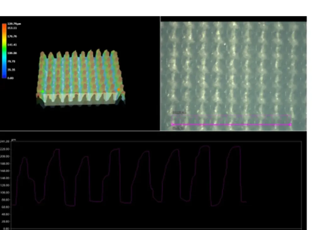 超短パルスレーザ加工 USP Laser Processing 石英ガラス 溝加工 詳細 DETAIL 属性 ガラス・セラミック加工 材料名 ガラス 加工種類 超短パルスレーザ加工 加工方法溝加工 石英ガラスに突起形状をレーザにて作成。200µm以上の深い突起形状が高精度に加工できています。 関連キーワード KEYWORD ガラス 微細溝加工 機械部品応用
