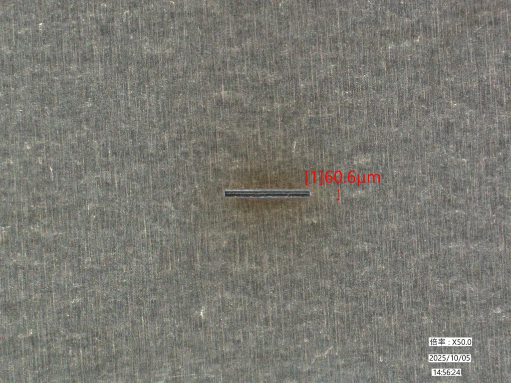厚さ0.4mmのチタン箔への精密スリット加工です。幅60µmの微細スリットを超短パルスレーザで加工してあります。