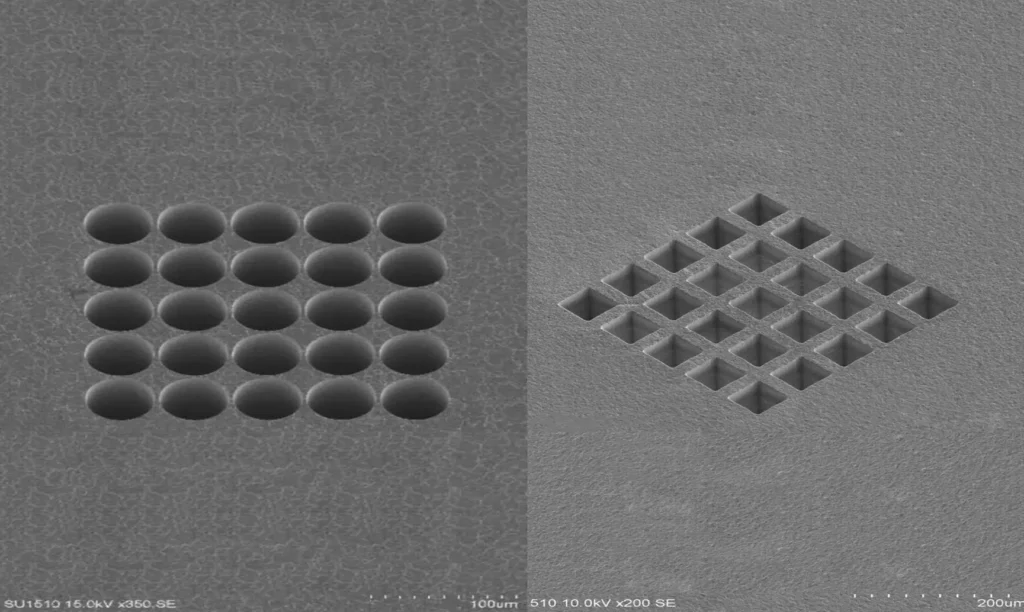 超短パルスレーザ加工 USP Laser Processing 角穴加工 詳細 DETAIL 属性 ガラス・セラミック加工 材料名 SiN 加工種類 穴加工 加工方法穴加工 窒化シリコンへの50µm四角形状の貫通穴です。穴の角のRも小さく、高精度な加工ができます。 関連キーワード KEYWORD 四角 微細 窒化シリコン 貫通穴