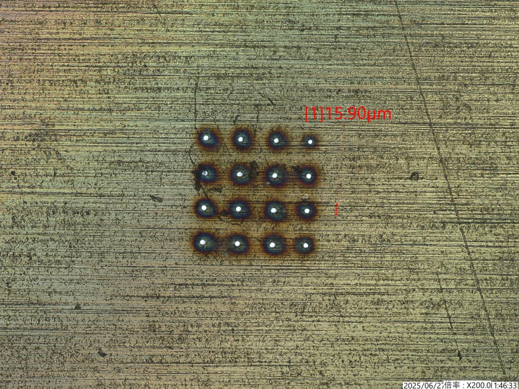 超短パルスレーザ加工 USP Laser Processing 15µm穴加工 詳細 DETAIL 属性 金属加工 材料名 ステンレス 加工種類 穴加工 加工方法穴加工 厚さ100µmのSUSへ高精度な微細穴加工です。直径φ15µmで高精度な穴加工を実現しました。 関連キーワード KEYWORD ステンレス 多穴 微細穴