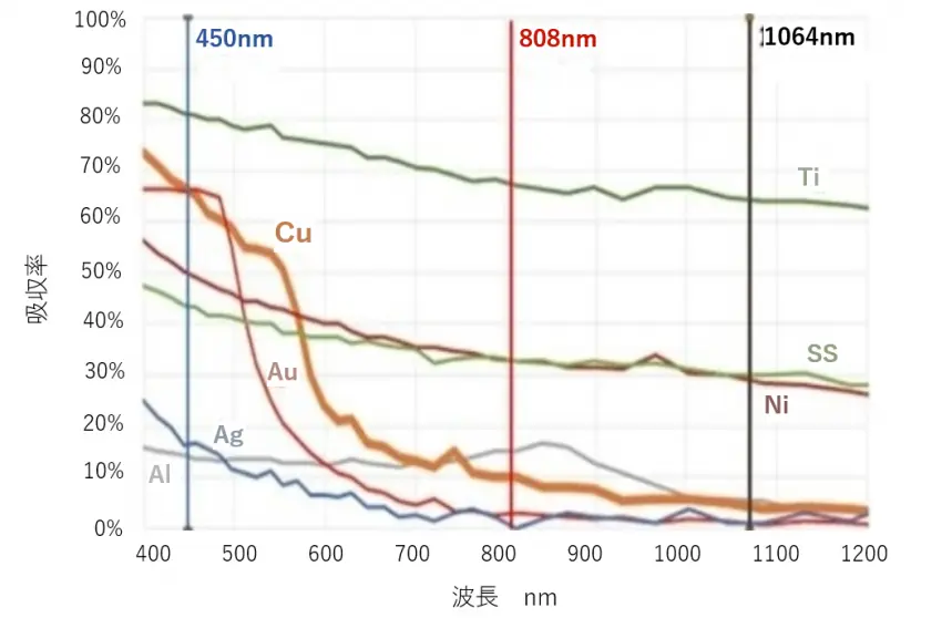 - 吸収率の高い波長:金 (Au) や銅 (Cu) など金属材料への光吸収率が高い波長450nmのレーザです。材料ダメージを最小に抑え、高効率な加工が実現可能です。